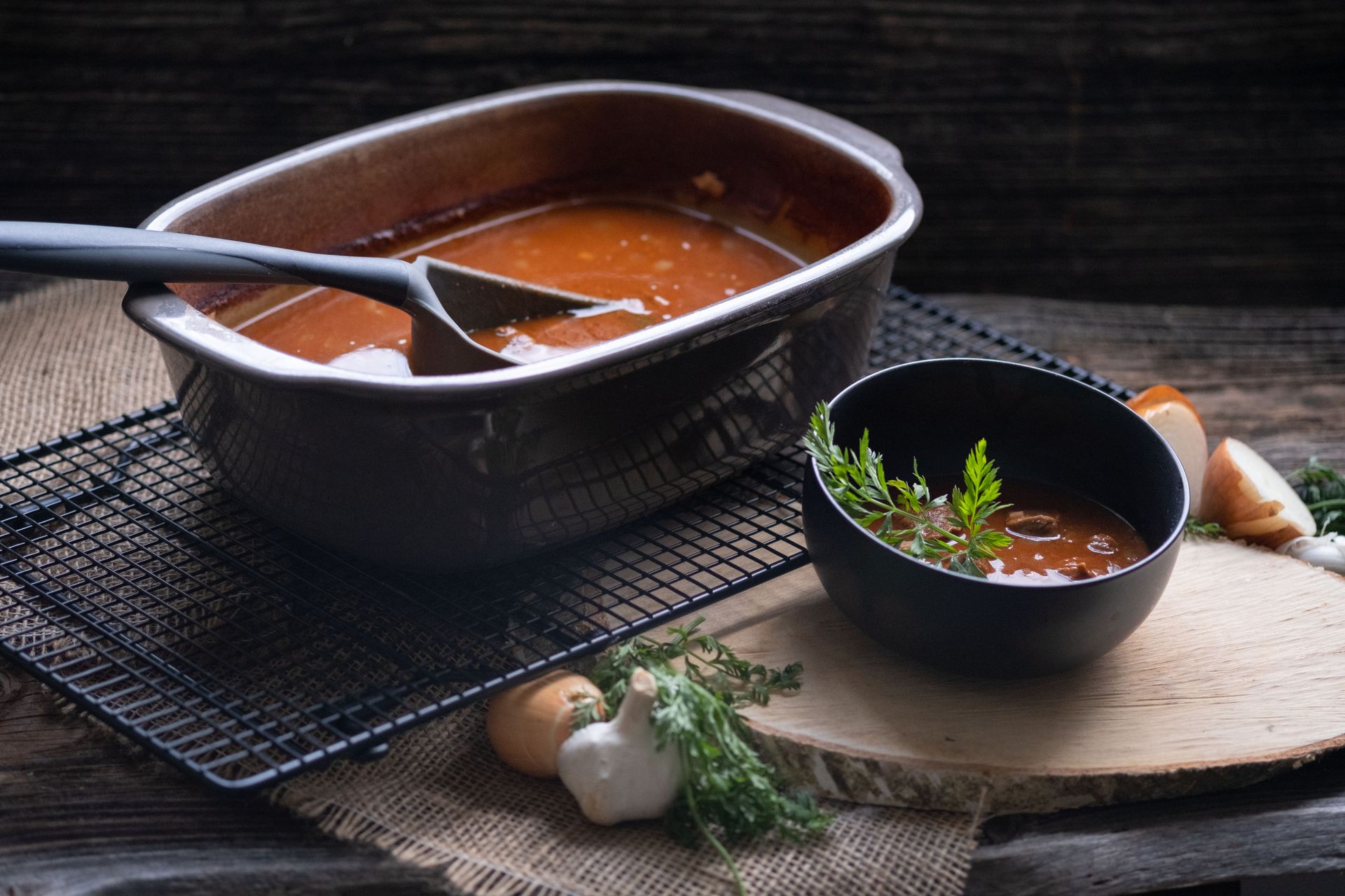 Thymian, Oregano, Basilikum, Salz, Pfeffer dazugeben und dann für ca. 20-30 Minuten köcheln lassen.